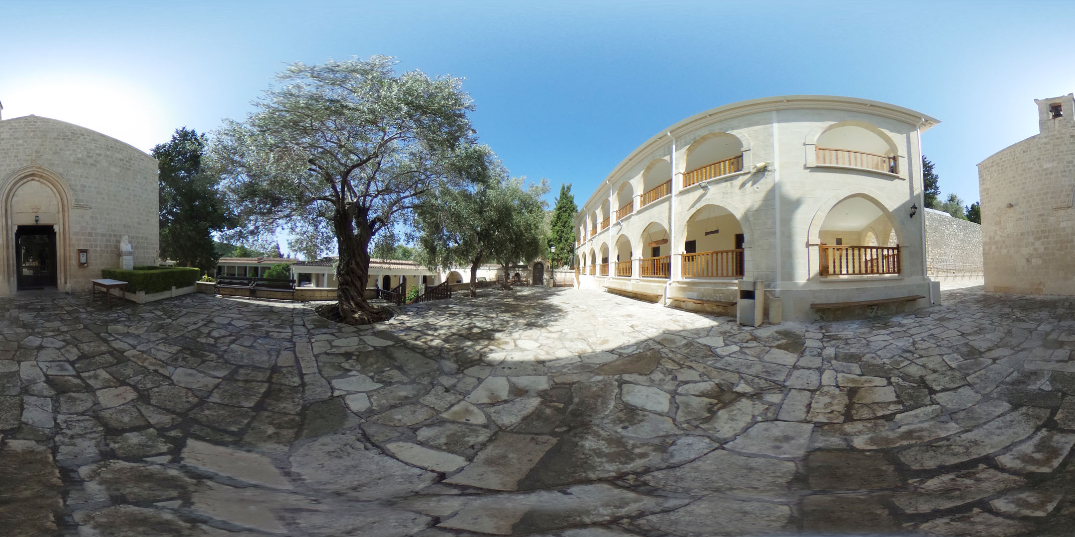 Der ursprüngliche Kern des Klosters bestand aus geschnitzten Höhlen auf dem natürlichen Felsen, in denen der Heilige bis zu seinem Tod eingeschlossen lebte. Deshalb wurde das Kloster Engleistra genannt. Dort kann man seine zweigeschossige Einsiedelei besichtigen, in der es einen Raum zum Lernen und Schreiben gab, sowie sein Grab. Es gibt auch eine kleine geschnitzte Narthex-Kirche, die dem Heiligen Kreuz gewidmet ist. Äußerlich handelt es sich bei den Bögen, die wir heute vor den Höhlen sehen, um spätere Ergänzungen der Antikenabteilung Zyperns.